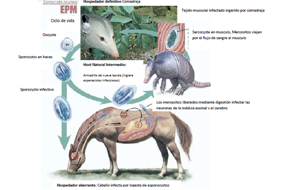 Tomado y modificado de Martin Furr, DVM, Dip ACVIM, PhD, 2006, Immunity, Pathophysiology, and Diagnosis of Equine Protozoal Myeloencephalitis, Clin Tech Equine Pract 5:3-8.